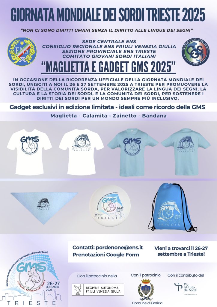 La GMS 2025 è organizzata dall’ENS nelle sue diverse articolazioni: Sede Centrale, Consiglio Regionale Friuli-Venezia Giulia e Sezione Provinciale di Trieste con il supporto del Comitato Giovani Sordi Italiani e le Sezioni Provinciali della regione.